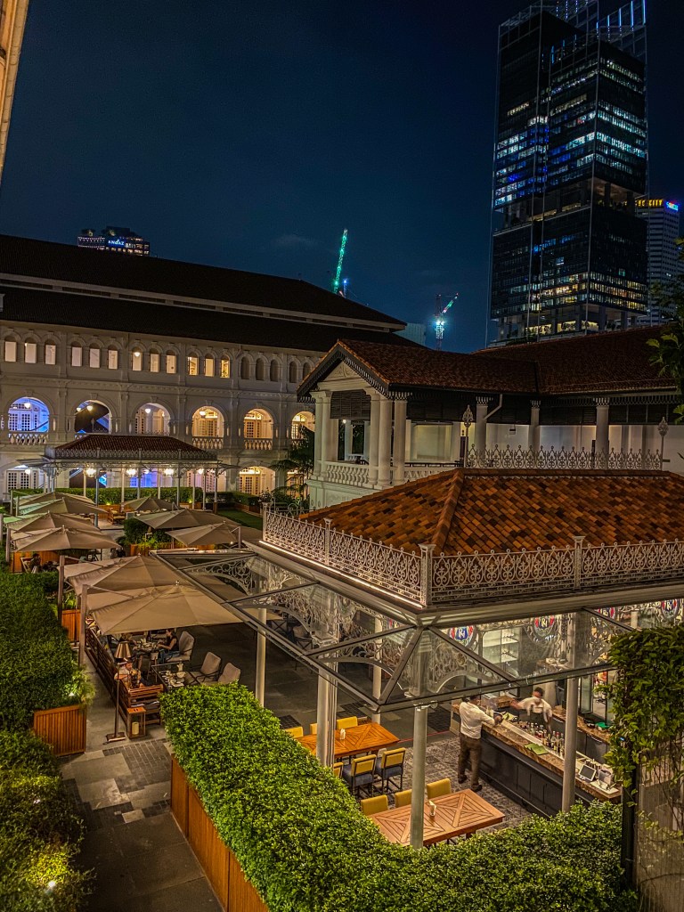 To właśnie tutaj w 1915 roku powstał singapurski narodowy koktajl zwany Singapore Sling, bazujący między innymi na brandy, ginie, soku ananasowym, soku z limonki, Curacao i Cointreau. Słynny drink kosztuje 35$ (100 zł), jednak naprawdę warto! Każdy klient dodatkowo dostaje do chrupania fistaszki, których skorupki można swobodnie zrzucać ze stołu (a przynajmniej tak było w czasach przedpandemicznych) – jest to zapewne jedyne miejsce w Singapurze, w którym można śmiecić 😉 Hotel Raffles został odremontowany pod koniec 2019 roku i stanowi perełkę architektoniczną czasów kolonialnych. Wystrój Long Bar natomiast inspirowany jest malajskim życiem lat 20. XX wieku. Głębokie, bogate kolory i soczysta zieleń przenoszą klientów na skraj tropikalnej plantacji.